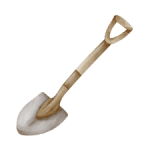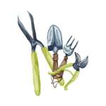 Tools like shovels, rakes, and hoses used for maintaining the garden.