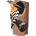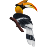 A large bird with black, yellow, or red feathers and a huge curved beak.