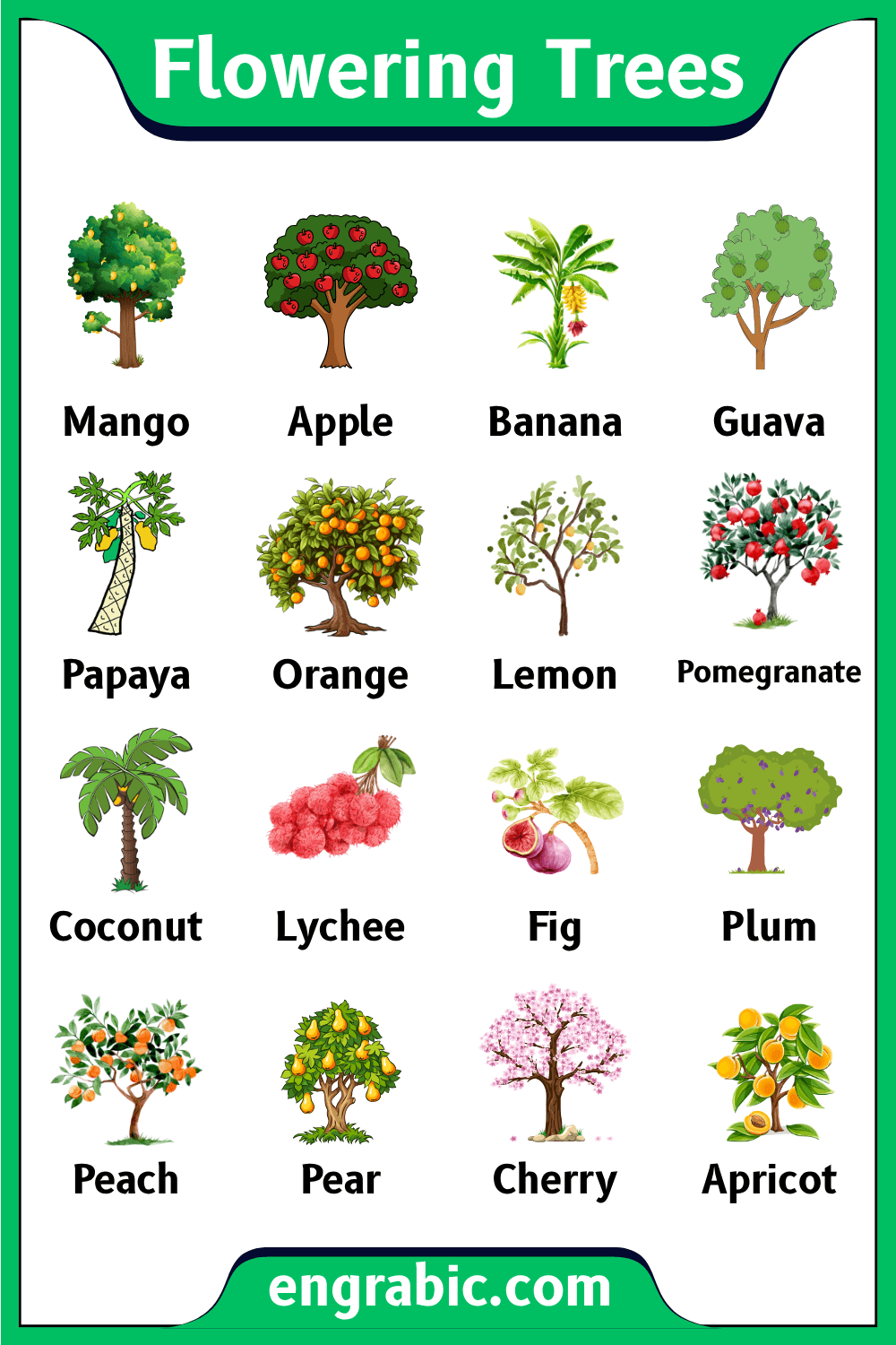 Examples include mango, apple, and neem trees, which are commonly found flowering and fruit-bearing trees. -